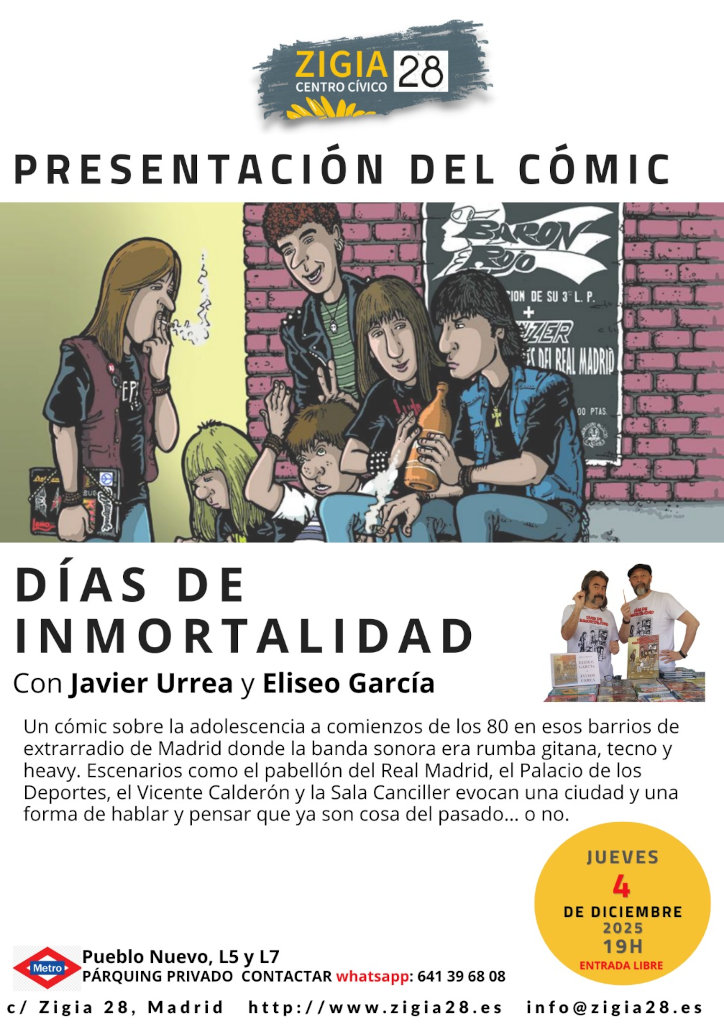 El jueves 4 de diciembre de 2025 a las 19:00 tendrá lugar una presentación del cómic DÍAS DE INMORTALIDAD en el Centro Cívico ZIGIA 28 en Madrid, con el guionista Eliseo García y el dibujante Javier Urrea.