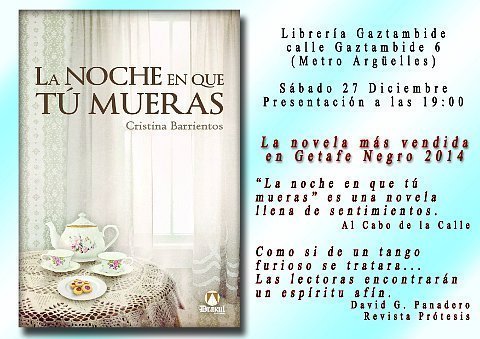 Este sábado 27 de diciembre a las 19:00, en la librería Gaztambide (C/ Gaztambide 6, metro Arguelles, Madrid), realizaremos el último evento de Editorial Drakul en 2014, presentando la novela La noche en que tú mueras con la autora Cristina Barrientos. Tras la presentación tomaremos una copa de cava para celebrar su éxito y despedir el año.