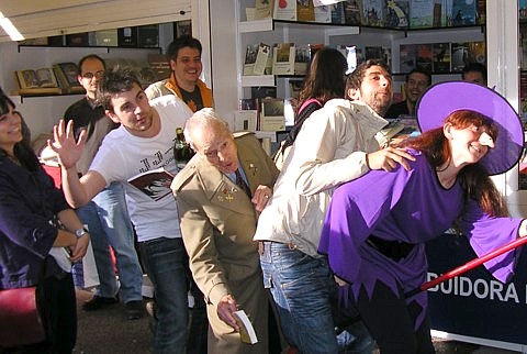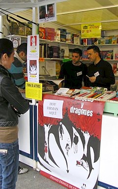 Y es que durante el primer día de firmas de Moscas y dragones se organizó espontáneamente delante del stand una pequeña fiesta a la que se unieron rápidamente algunos de los personajes que pueblan el parque de El Retiro.