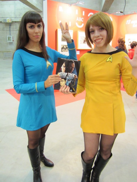 Dos oficiales de Star Trek en el Expocomic posando con el comic Star Trek: Hacia la oscuridad
