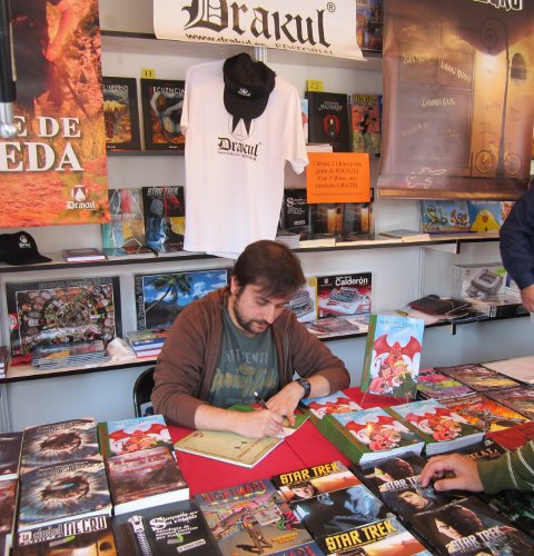 Francisco Maldonado firmando ejemplares de su cómic en la caseta de Editorial Drakul.