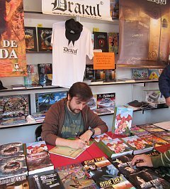 Francisco Maldonado firma su cómic Crónicas de Némeldren, el día del dragón en la caseta de Drakul.